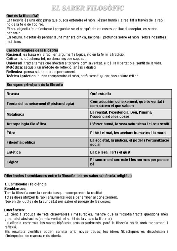 Este tema contiene (Què és la filosofia; Característiques; Branques principals; Filosofia i ciència; Filosofia i religió; Veritat i validesa; Tipus d’arguments (deductiu, inductiu, abductiu); Lleis lògiques; Fal·làcies; Símbols lògics; Exemple de Sòcrates