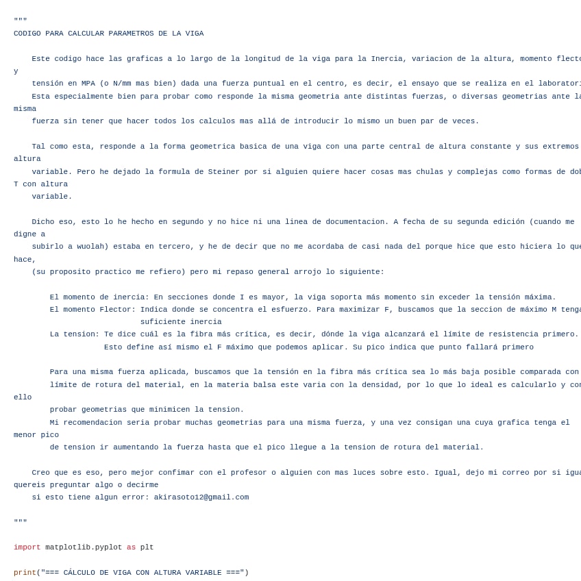 Codigo y ejecutable para calcular los parametros de la viga de la practica. Solo hace falta introducir los datos que pide en la terminal y sacara las graficas para la Inercia, variacion de la altura y momento flector dada una fuerza puntual en el centro.