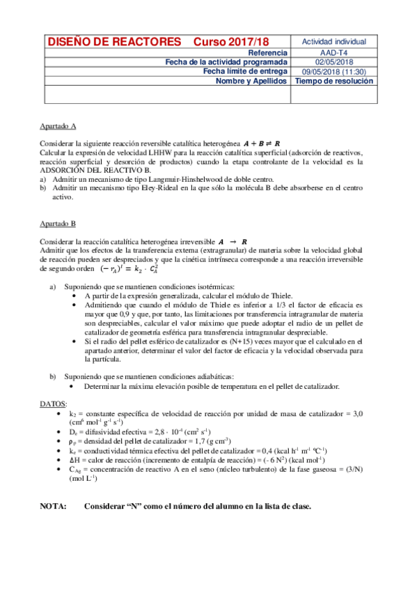 He publicado nuevos ejercicios de 3º Ingeniería de la Reacción Química: AAD-01-solucion.pdf
