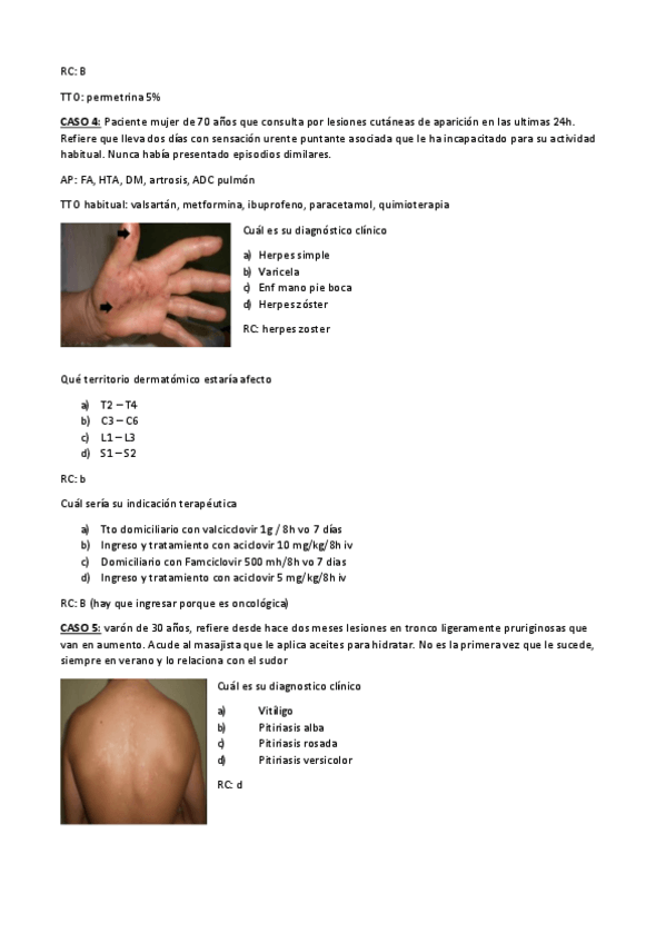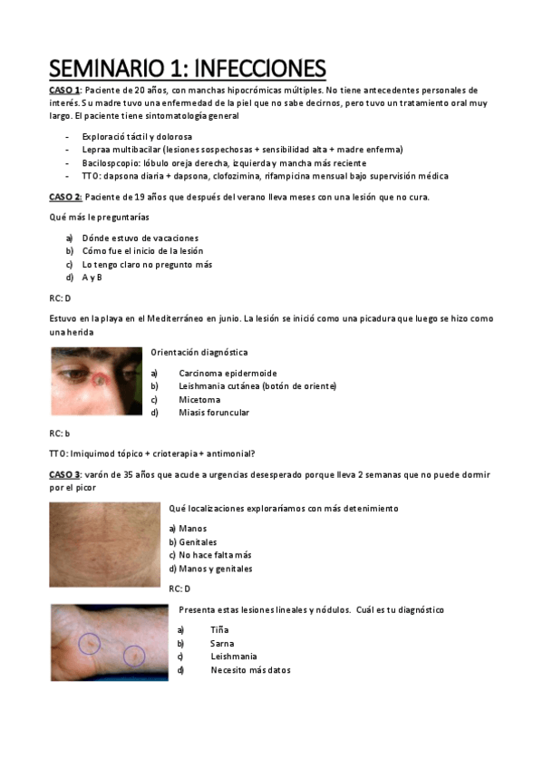 Seminarios clínicos de la asignatura de dermatología, incluye imágenes y las respuestas correctas