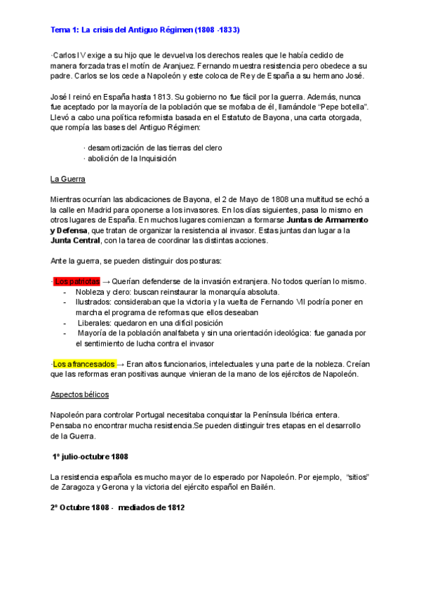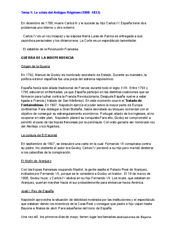 Tema 1 Guerra de la Independencia y Fernando VII (saqué un 9'8 en la Pau de Historia de España)