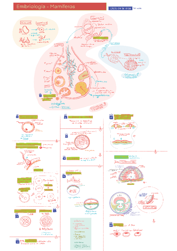 Esquema ilustrado de embriología, con las fases desde la ovulación hasta la nidación
