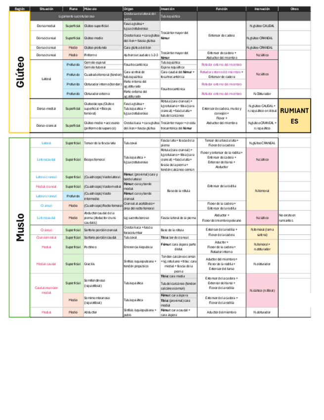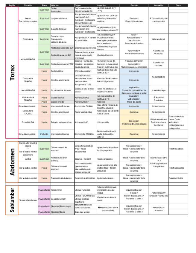 Tabla de músculos del segundo parcial de miología. Incluye TÓRAX, ABDOMEN, SUBLUMBAR, GLÚTEO,MUSLO Y PIERNA.