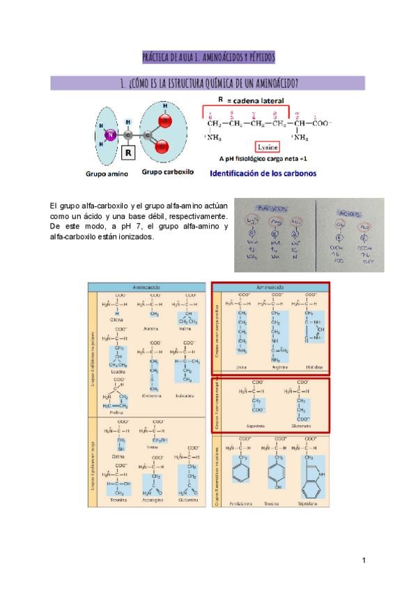 Apuntes, cuestionario y ejercicios de la Práctica de Aula 1: Aminoácidos y Péptidos.