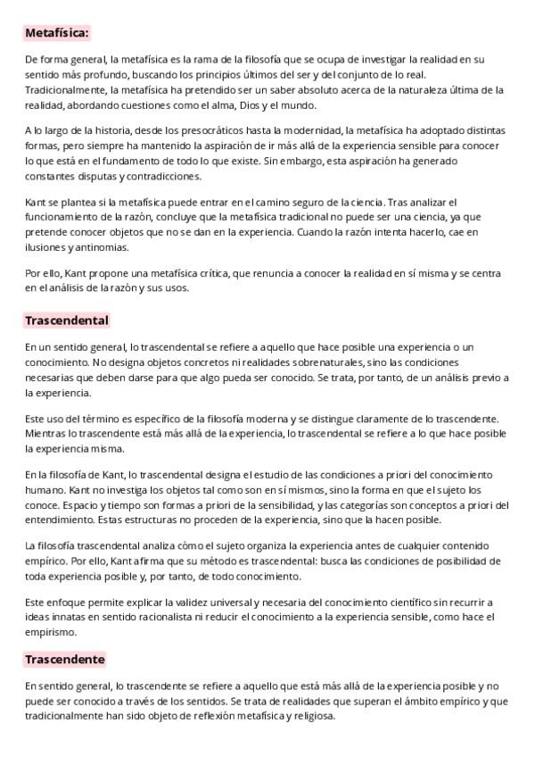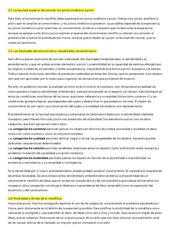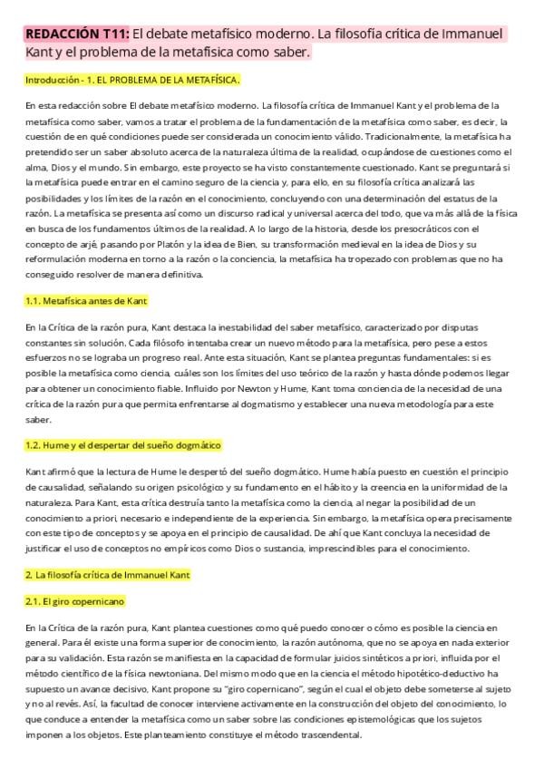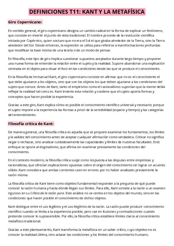 Resumen Filosofía T11 El debate metafísico moderno. La filosofía crítica de Immanuel Kant y el problema de la metafísica como saber. Con redacción y actualización