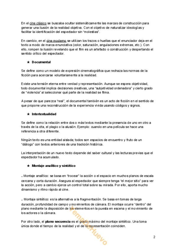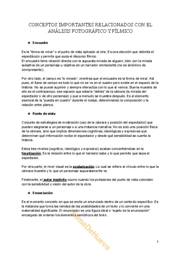El documento incluye definiciones sobre: encuadre (campo, fuera de campo y contracampo), punto de vista (focalización, ocularización y autor implícito), enunciación, documental, intertextualidad, montaje analítico y sintético (plano secuencia), iconoclasi
