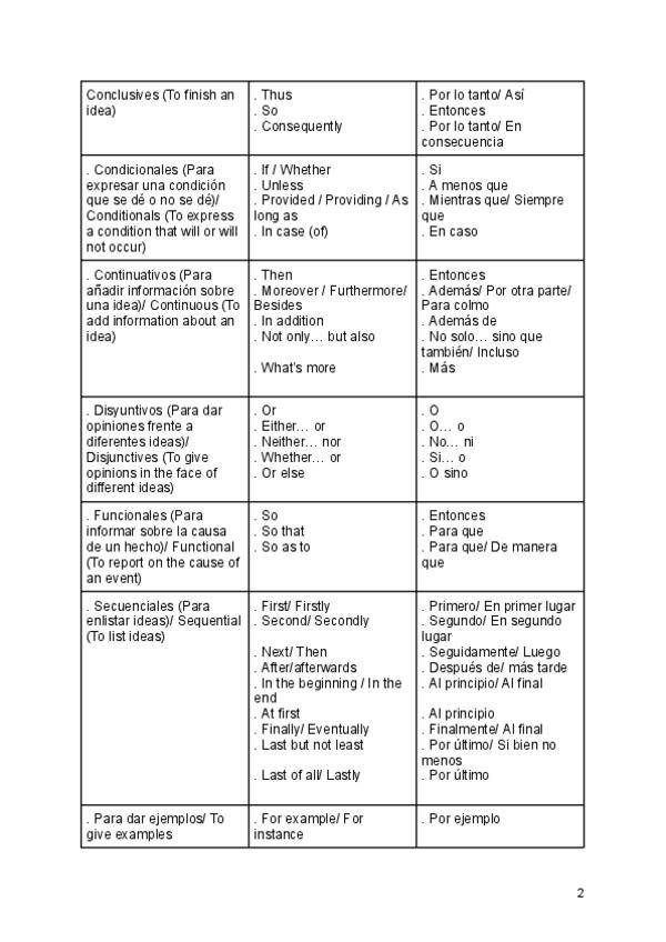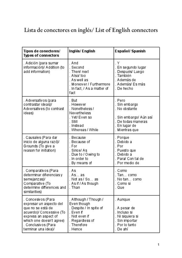 Lista de conectores en ingles con la clasificación por: tipo de conector, el conector en ingles y la traducción al español del mismo.