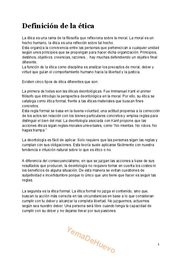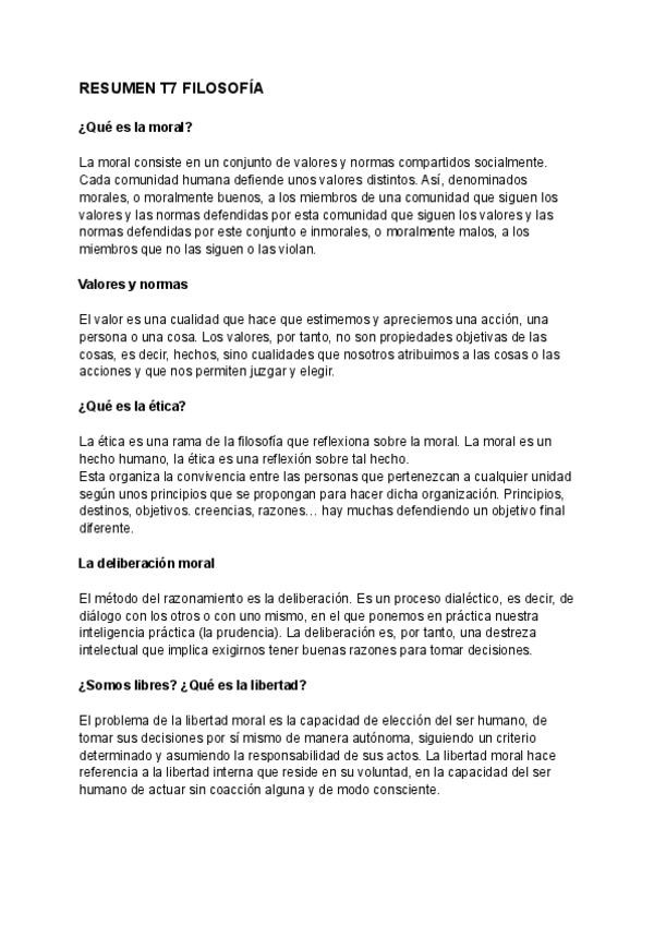 Resumen sobre la ética y los tipos que hay, la moral (valores y normas, deliberación moral...) y la pregunta de si somos libre y qué es libertad.