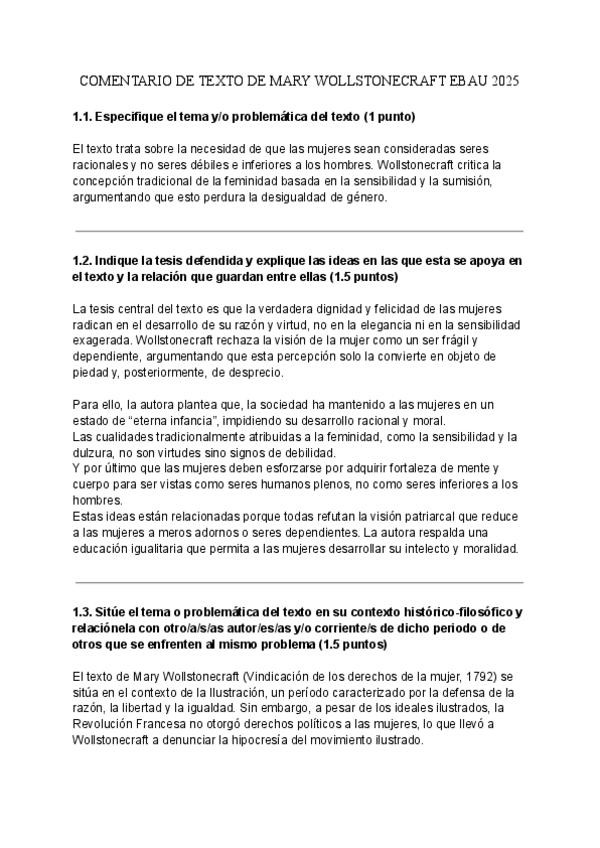 Comentario de texto de Mary Wollstonecraft de la EBAU de 2025.
