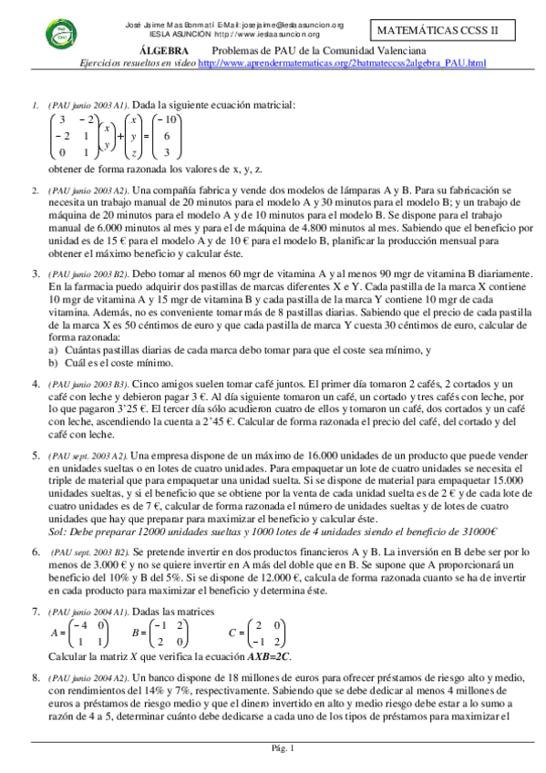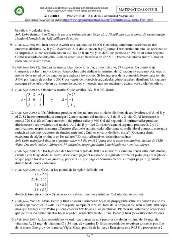 He publicado nuevos ejercicios de Matemáticas aplicadas a las Ciencias Sociales II: Problemas-Algebra.pdf