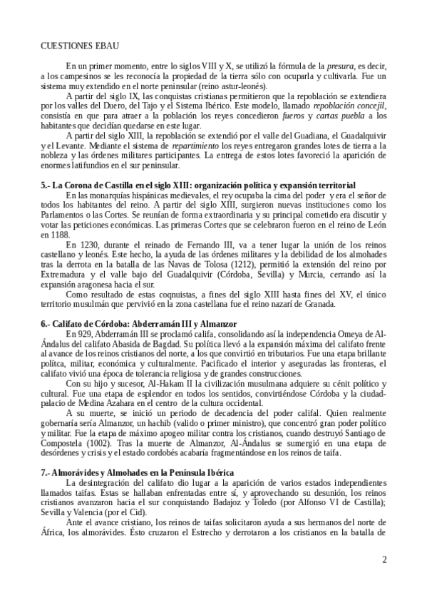. El concepto de "unión dinástica" El reinado de los Reyes Católicos ha sido considerado como el punto de partida de la Edad Moderna en España. Sin embargo, la unión (1469) entre Isabel de Castilla y Fernando de Aragón fue de tipo matrimonial; esto es, era una unión dinástica, por cuanto ambos reinos van a tener desde ahora los mismos monarcas, pero conservando su peculiaridades medievales. En 1475 se produce la unión dinástica de las Coronas de Castilla y Aragón mediante la Concordia de Segovia, acuerdo por el que cada reino mantenía sus leyes, instituciones y fronteras. No es, pues, una unidad institucional de los dos reinos, es solo una unión personal, y no un estado centralista y unificado. Todos los reinos tendrán idénticos soberanos, pero los distintos reinos no formarán un solo Estado. Sin embargo, esta unión contribuyó a la creación de la denominada Monarquía Hispánica. Castilla, por su mayor tamaño, población y poder económico, era hegemónica dentro de la Monarquía hispánica. B. Características del nuevo Estado En estas circunstancias, los Reyes Católicos se marcaron el objetivo de transformar una monarquía de carácter feudal (donde el poder político estaba fragmentado por los señoríos jurisdiccionales) en una monarquía moderna y autoritaria (con un poder cada vez mas centralizado en la monarquía), para ello iniciaron una reorganización del Estado adoptando una serie de medidas para reforzar la autoridad de la monarquía. Estas medidas fueron: Se limitó el poder de la nobleza. la nobleza que apoyó a Juana “la Beltraneja” vio confiscada sus señoríos que fueron dados como señoríos territoriales (no jurisdiccionales) a la nobleza afín. Por lo que se refiere a la Iglesia, los reyes lograron del Papa Sixto IV la ampliación del Patronato real en la provisión de cargos, esto es, las personas propuestas por los reyes para ocupar los altos cargos serían, de hecho, nombrados por Roma. Esto permitió a los reyes controlar indirectamente todos los señoríos eclesiásticos al colocar personas leales a los monarcas. Se controló a las órdenes Militares. Se presionó a las órdenes Militares para que nombrasen al rey como su gran maestre cuando el cargo quedase vacante. En cuanto a las Cortes, mantuvieron su estructura medieval. El instrumento esencial de gobierno fueron los Consejos, puramente consultivos. El Real Consejo de Castilla llegó incluso a invadir funciones legislativas de las cortes castellanas. A su lado aparecieron otros: el Consejo de Aragón, el de la Inquisición, el de órdenes, etc. Se creó un ejército permanente. Así se crearon tropas a sueldo lo que permitió eliminar la dependencia que los monarcas tenían de las tropas de la nobleza. También se creó una diplomacia igualmente permanente. Por último, se empleo la religión como nexo de la unidad territorial. La religión contribuyó a hacer de la fe cristiana el elemento común y definidor de la “esencia” última de la Península (con exclusión, por ello, de judíos y musulmanes). Comenzó, así una dura política contra las dos minorías religiosas: judíos y musulmanes. Se decreta así la expulsión (1492 expulsión de los judíos) o conversión forzosa. Para vigilar a los supuestos falsos conversos establecen la Inquisición o Tribunal del Santo Oficio en 1478. El Tribunal del Santo Oficio estaba bajo la autoridad directa de los reyes, que lo utilizaron como instrumento de su política autoritaria. En suma, el reinado de los RRCC, desde un punto de vista político, representa un estadio de monarquía autoritaria, como etapa de transición a la monarquía absoluta característica de la Edad Moderna, puesto que establecieron las primeras bases de un Estado moderno que desarrollaron después sus sucesores.