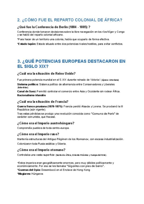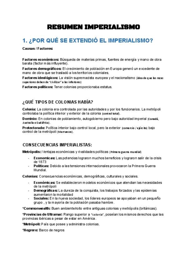 Este documento resume los principales contenidos sobre el imperialismo del siglo XIX y la evolución política de España durante ese mismo periodo. Incluye causas y consecuencias del imperialismo, el reparto de África, las potencias europeas y no europeas,