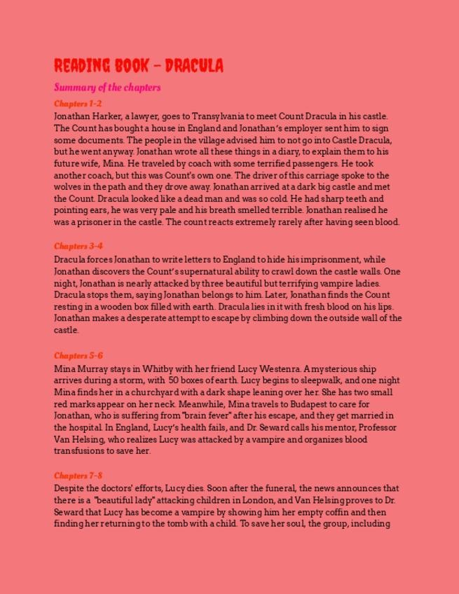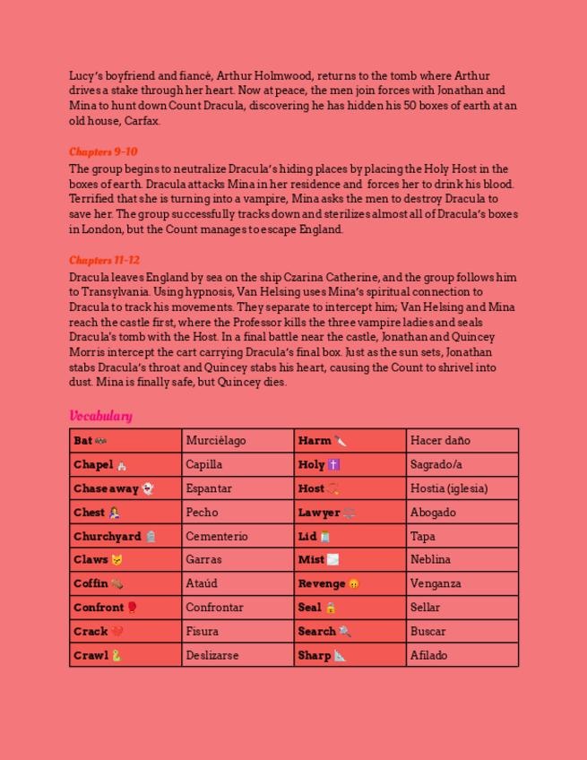Resumen de los capítulos + vocabulario del libro DRACULA de burlington books.