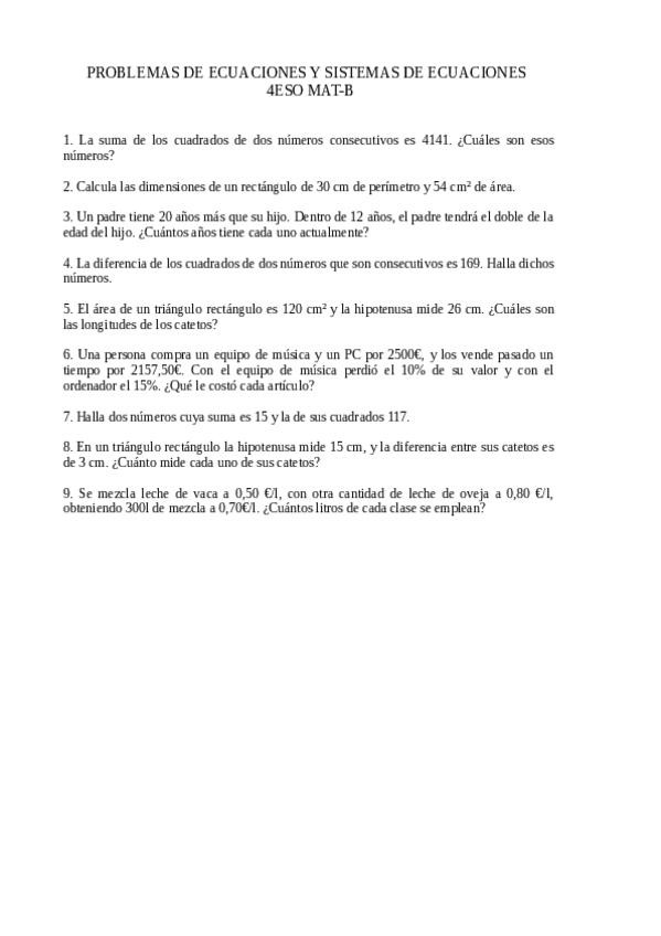 Ejercicios de problemas de sistemas de ecuaciones