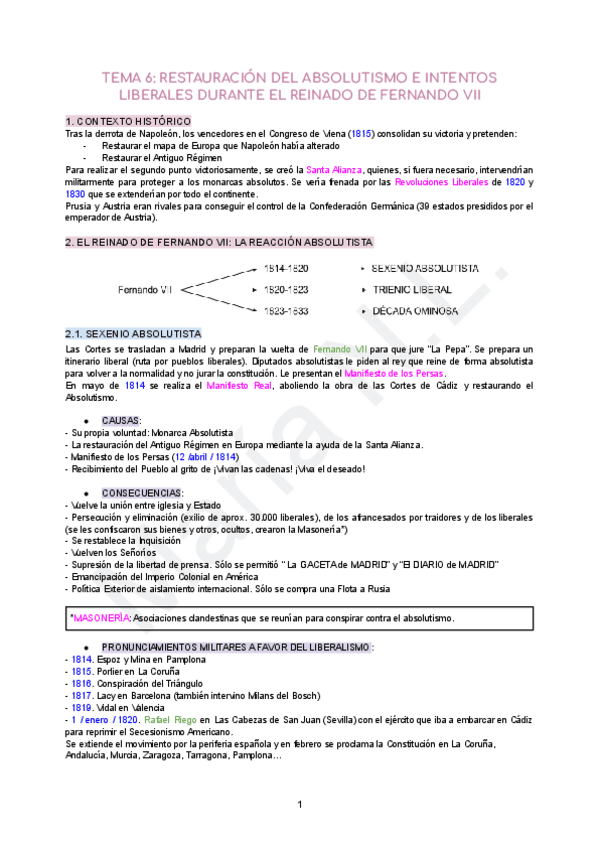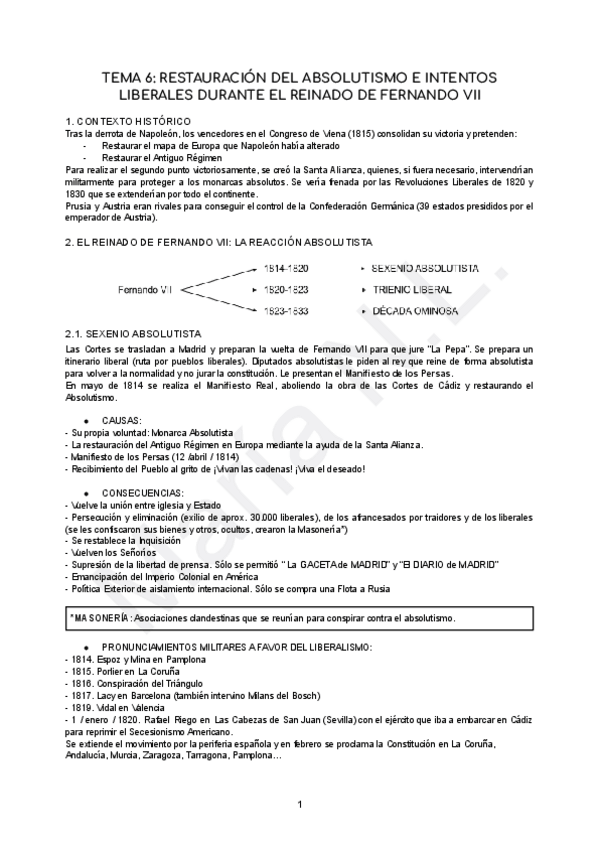 RESTAURACIÓN DEL ABSOLUTISMO E INTENTOS LIBERALES DURANTE EL REINADO DE FERNANDO VII