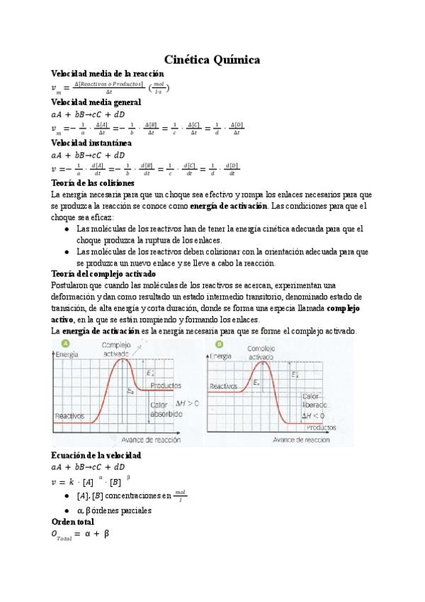 Resumen claro de cinética química: velocidad de reacción, ecuación de velocidad, teoría de colisiones y energía de activación. Incluye factores que afectan a la velocidad y ecuación de Arrhenius. Ideal para entender teoría + resolver preguntas de examen