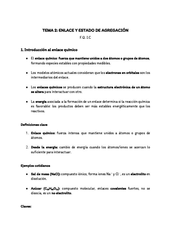Apuntes Tema 2 - Enlace y estado de agregación. Fundamentos Químicos de la Ingeniería Civil (UA).