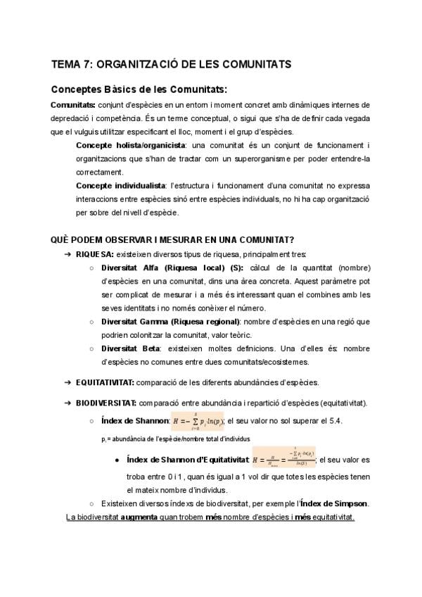Apunts i exercicis d'ecologia tema 7: organització de les comunitats.
