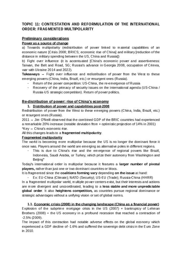 Analysis and history of what occurred since 2008 in power (topic 11), ideas (topic 12), and institutions (topic 13).