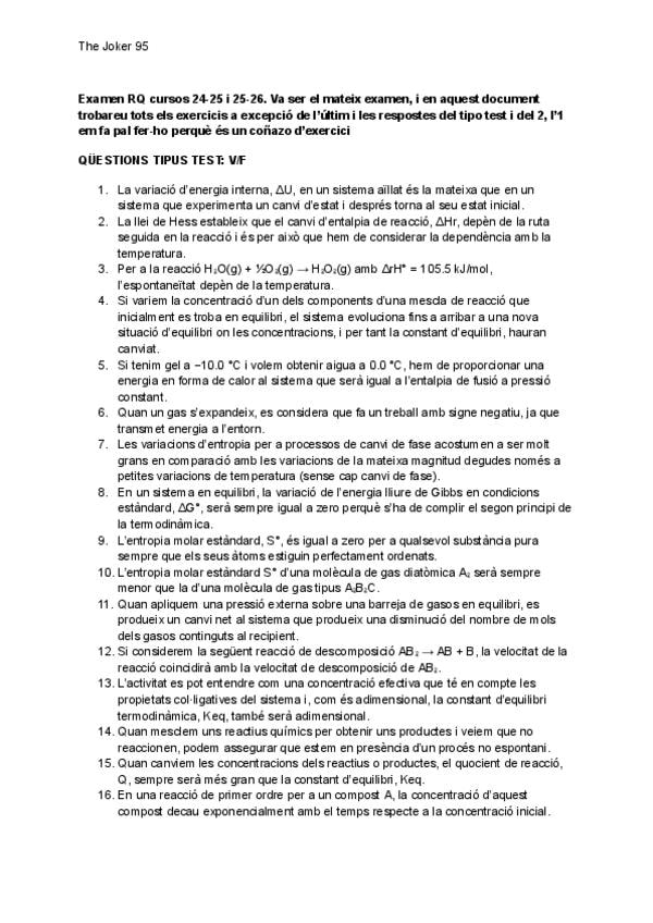 Examen RQ cursos 24-25 i 25-26. Va ser el mateix examen, i en aquest document trobareu tots els exercicis a excepció de l’últim i les respostes del tipo test i del 2, l’1 em fa pal fer-ho perquè és un coñazo d’exercici
