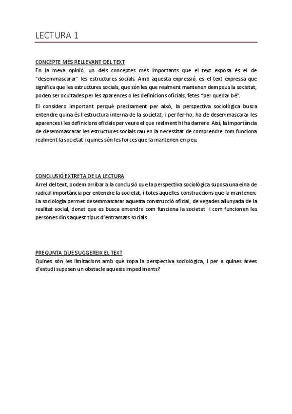 Activitat sobre: Lectura 1. Capítol 1 “La perspectiva sociològica”, de Cardús, Salvador (coord). La mirada del sociòleg : què és, què fa, què diu la sociologia. Barcelona: EDIUOC : Proa, 1999.