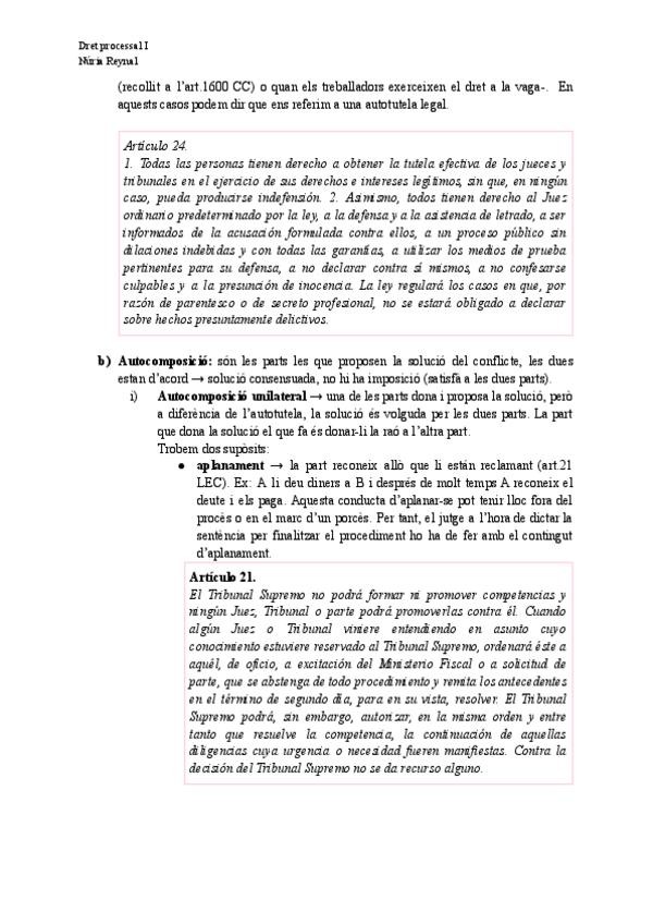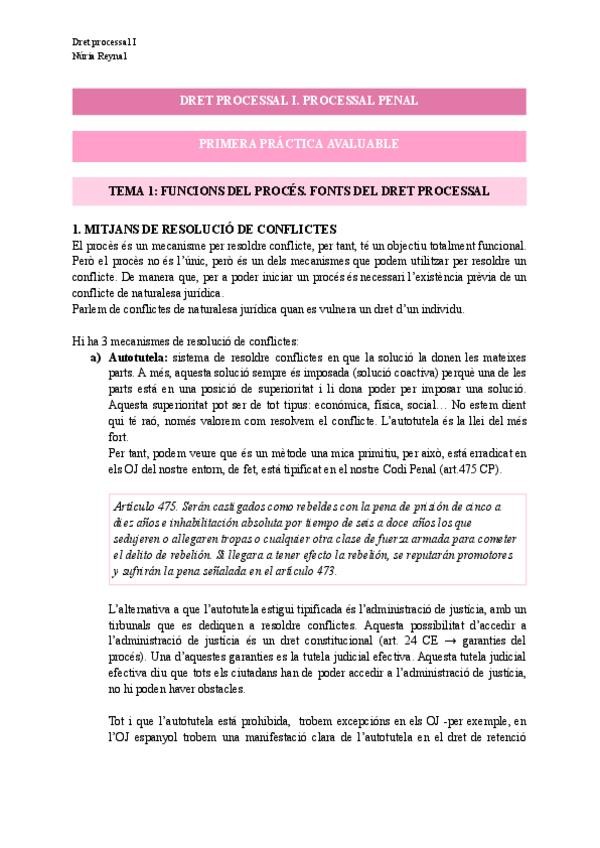 Apunts de tot el temari per l'examen final de dret processal I amb la professora Núria Reynal