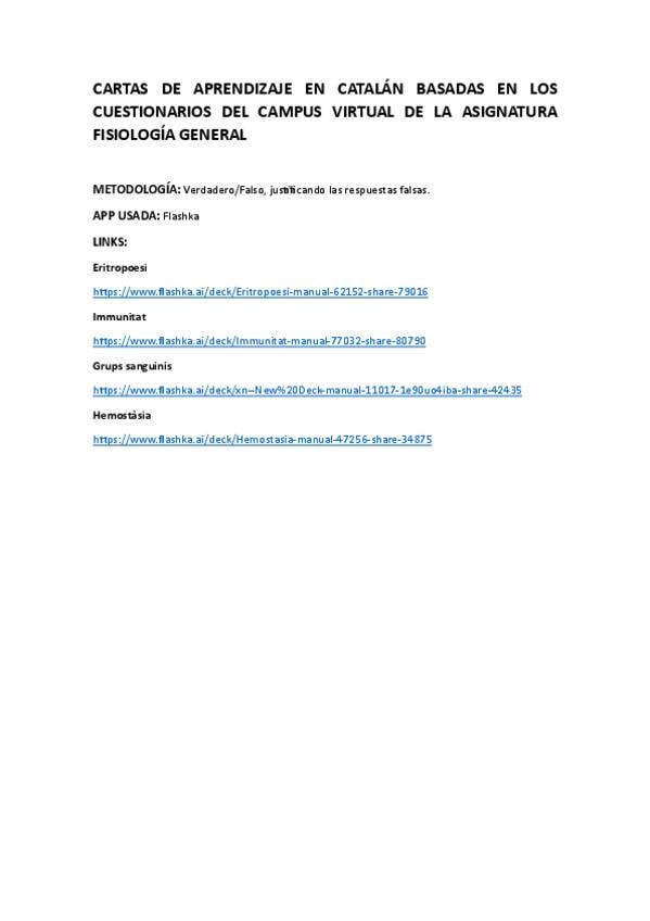 Cartas de aprendizaje en catalán basadas en los cuestionarios del campus virtual de la asignatura fisiología general. App utilizada: Flashka. Año 25/26.