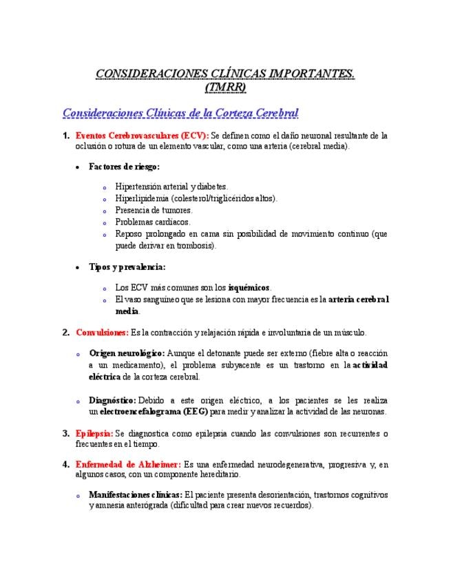 Resumen puntual de algunas consideraciones clínica importantes en la corteza cerebral, tálamo, hipotálamo, ganglios basales y senos venosos.