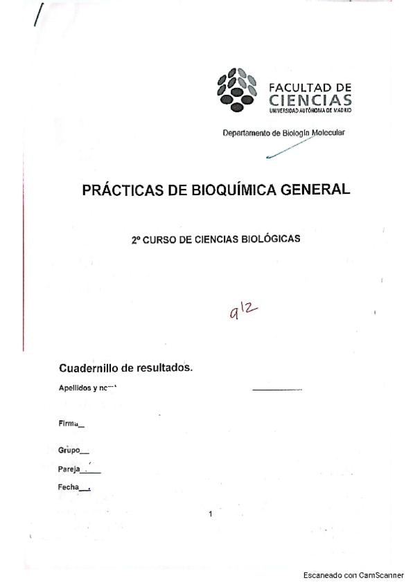 Cuadernillo de prácticas de bioquímica, calificado con un 9,2 y corregido