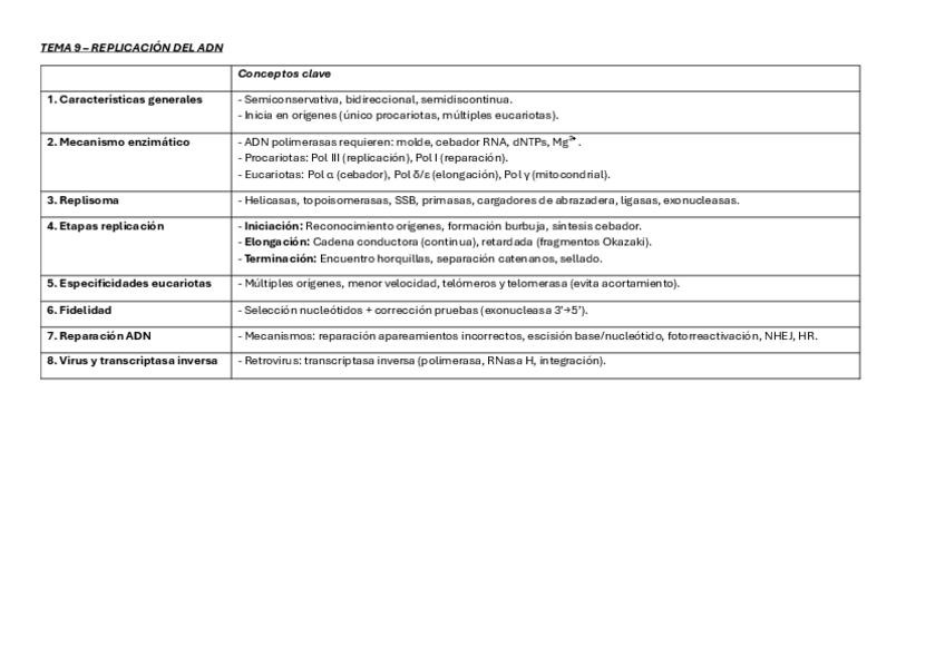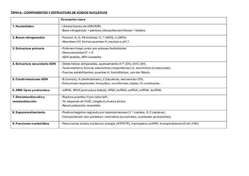 Una tabla por cada tema del segundo parcial de bioquímica