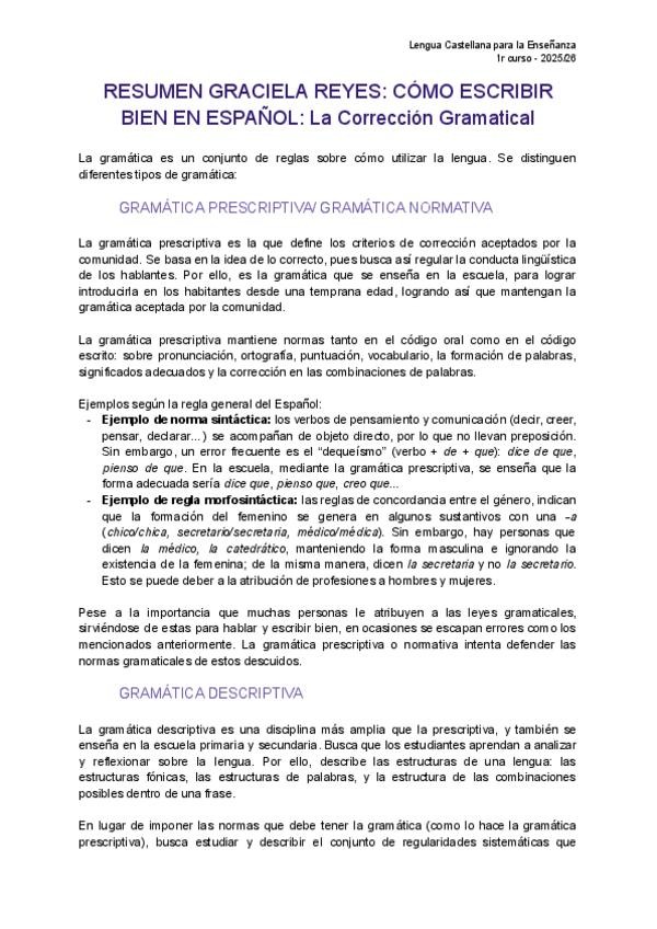 Resumen del capítulo "La corrección Gramatical" del libro de Graciela Reyes "Cómo escribir bien en español".