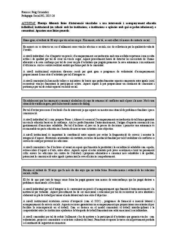 Activitat de 3 casos: -Home gran, al voltant de 80 anys que viu sol en un pis. Físicament, està bé, se sent aïllat i té manca de contacte social. -Un adolescent que ha començat a consumir alcohol en els caps de setmana i té conflictes amb el pare i la mar