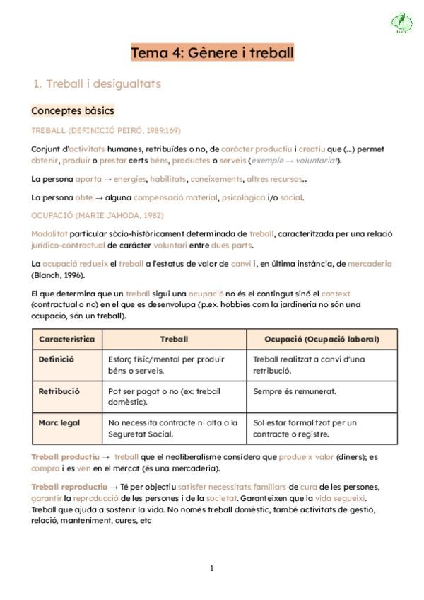 Apunts del tema 4 de societat, salut i benestar del curs 25/26, gènere i treball