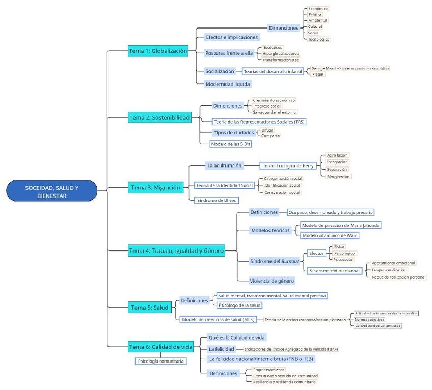 Esquema claro y con colores de todos los temas de la asignatura sociedad, salud y bienestar.