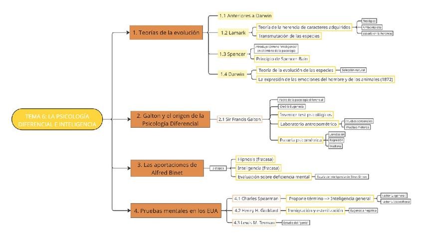 Esquema completo, visual y con colores. Tema 6 de historia. La psicología diferencial e inteligencia.