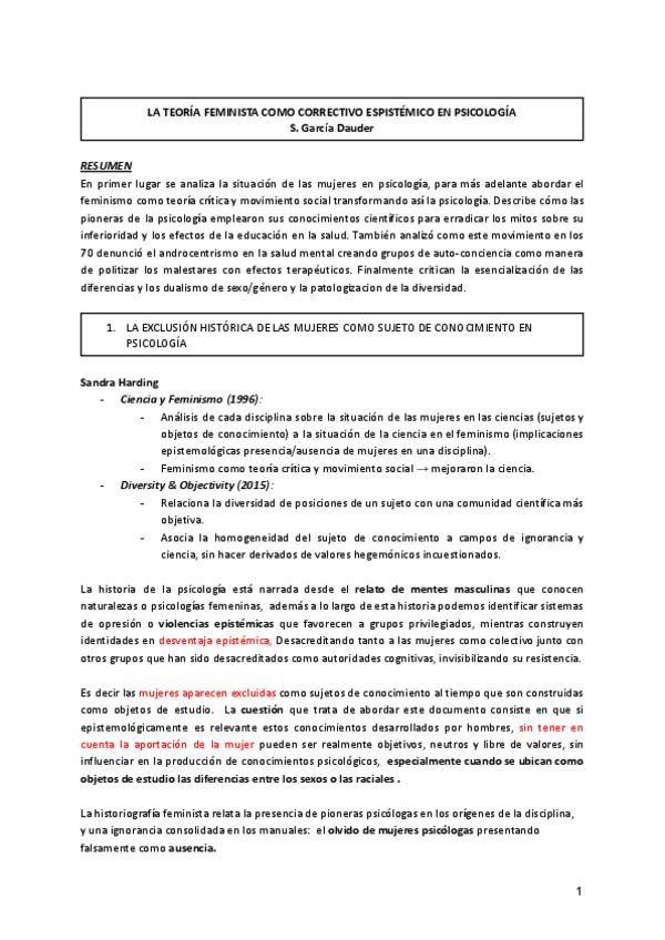 Resumen de la lectura que entra en examen, La teoría crítica feminista como correctivo epistémico en psicología S. García Dauder. M1, Joana Sierpowska
