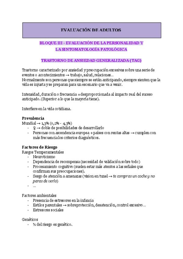 Apuntes optativa Evaluación de Adultos - Bloque 3 - Trastorno de Ansiedad Generalizada (TAG) + Test STAI + Estigma