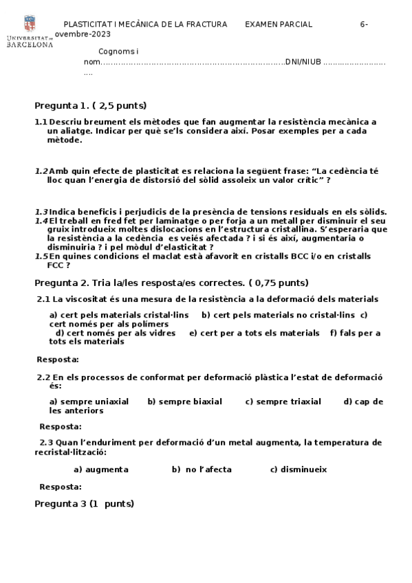 He publicado nuevos examenes de 3º Plasticidad. Mecánica de la Fractura: QUESTIONARI-AVALUABLE-Tema-1-oct-24-CV.docx