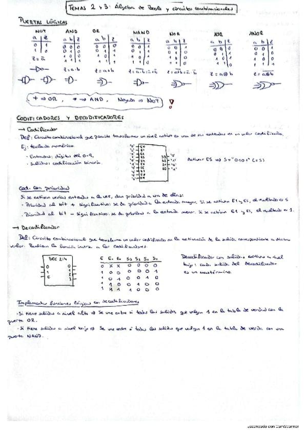 Resumen temas 2 y 3 de Tecnología de Computadores. Incluye puertas lógicas, codificadores, decodificadores, multiplexores y demultiplexores.
