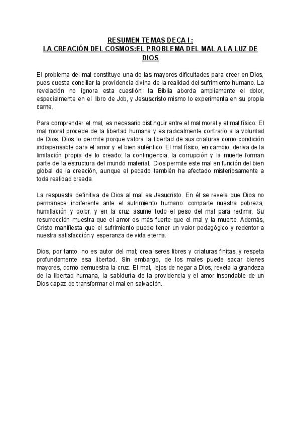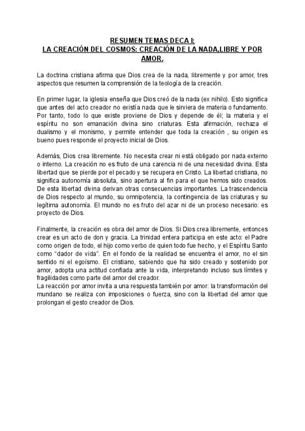 Resumen. La creación del cosmos: creación de la nada, libre y por amor