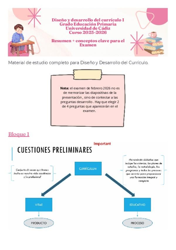 Resumen con los conceptos importantes del Bloque 1 y 2 para el examen de Diseño y Desarrollo del currículum 1 .