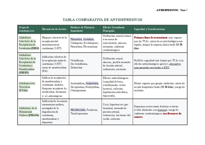 He realizado una tabla comparativa de todos los antidepresivos dados en clase. La tabla cuenta con el nombre del grupo, su mecanismo de acción resumido, fármacos, efectos secundarios y una última columna de consideraciones que hay que tomar.