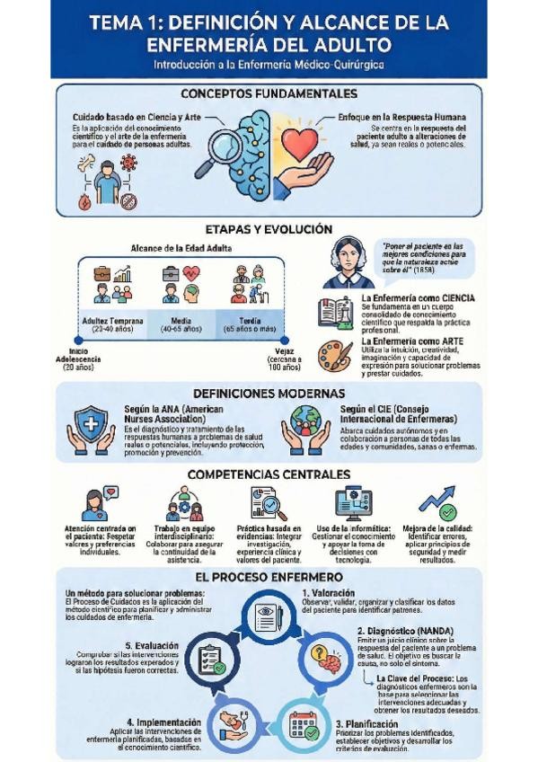 Esquemas gráficos estilo infografía de todos los temas de Enfermería en el Adulto I