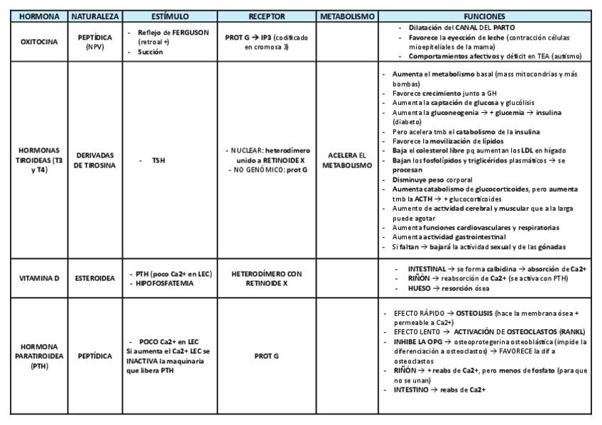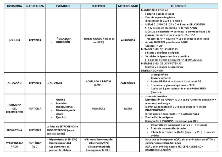 Tabla resumen de las principales hormonas con sus principales características y funciones