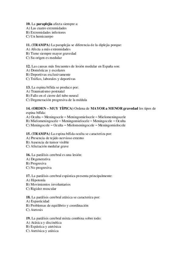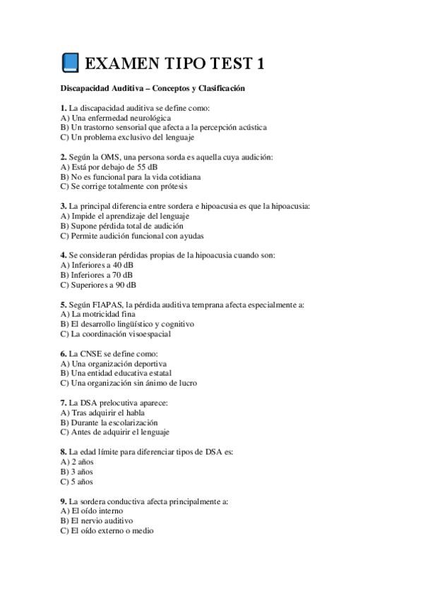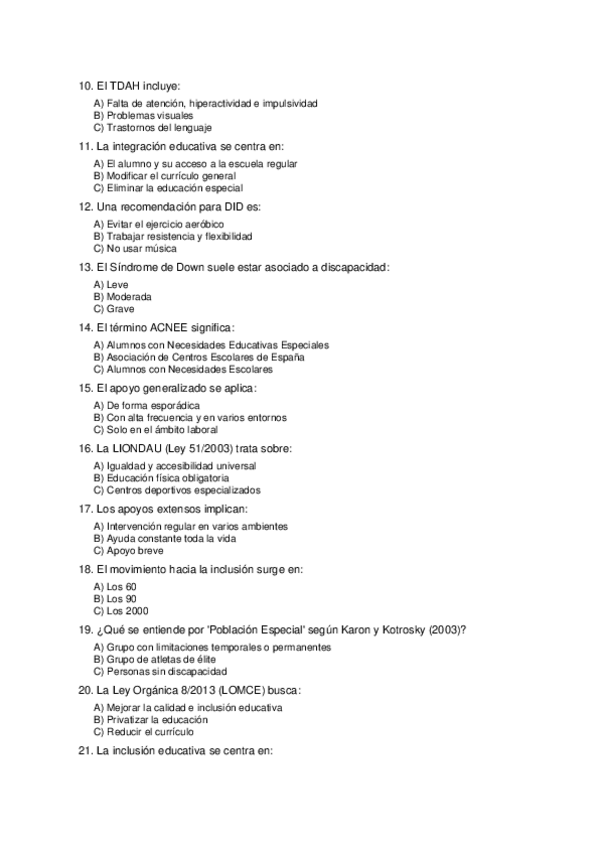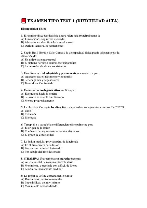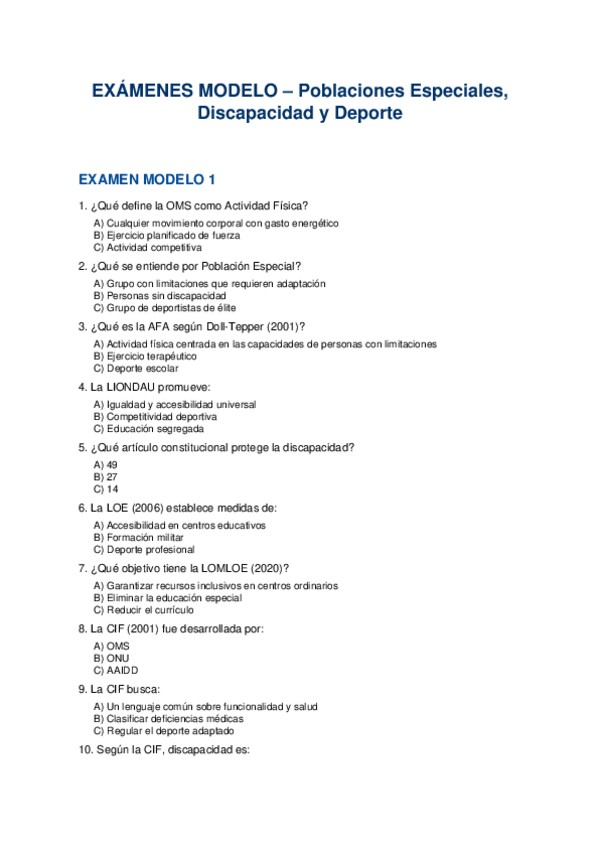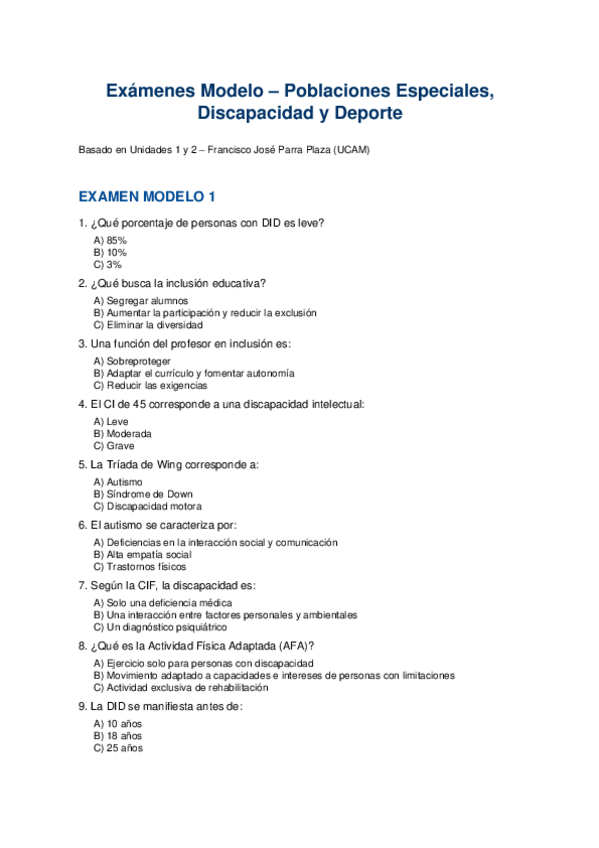 Examenes modelo para repasar 1º parcial poblaciones especiales, discapacidad y deporte (Mencion PT, UCAM)