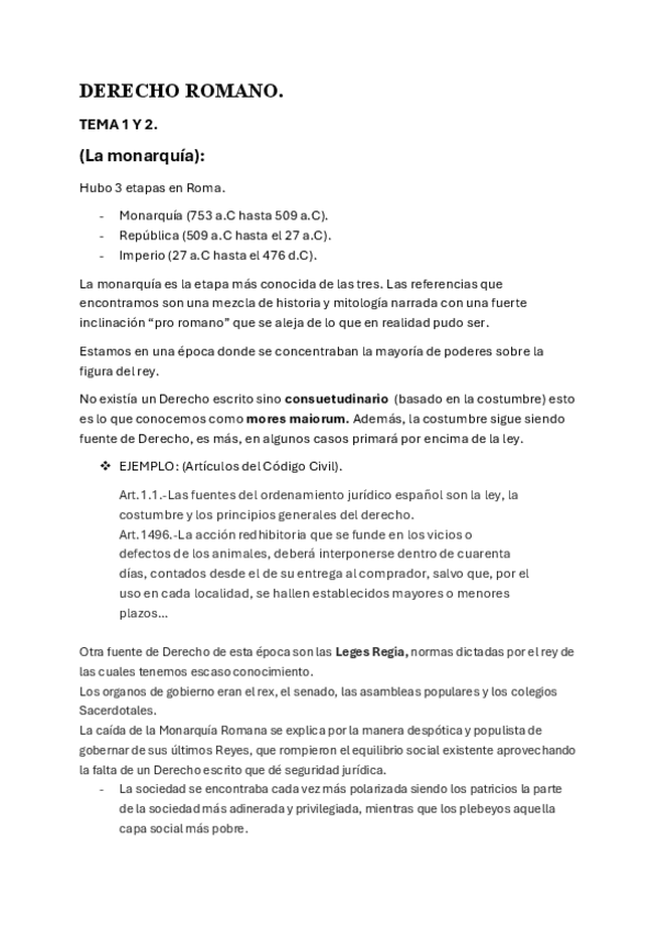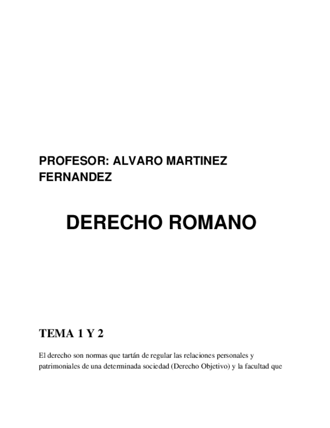 En este archivo podéis encontrar desde el tema 1 hasta el 5 de Derecho Romano. Tema 1 y 2 (monarquía, república e imperio) Tema 3 (El Derecho privado de las personas). Tema 4 y 5 (El Derecho procesal romano).