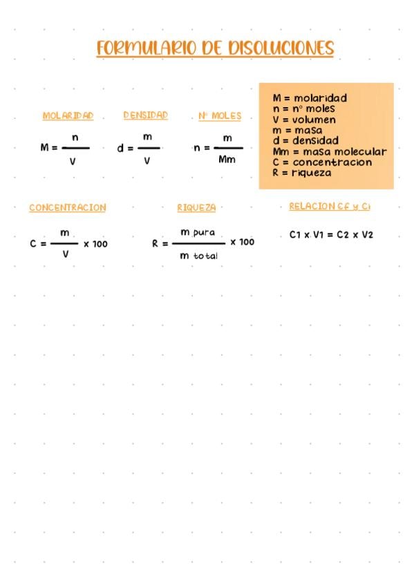 Aquí están todas las fórmulas necesarias para resolver los ejercicios de disoluciones tanto de química como de física :)