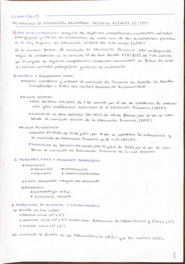 Apuntes del tema 1 (currículo) de Didáctica de los números y la estocástica. Curso 1º Educación Primaria de tardes 2025/2026.