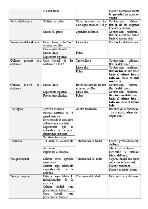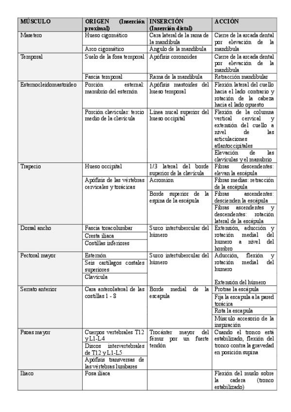 Esquema de los músculos importantes con su nombre, origen, inserción y acción.