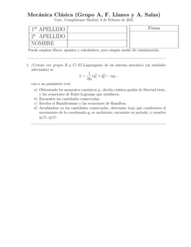 Examen Resuelto Mecánica Clásica Febrero 2021